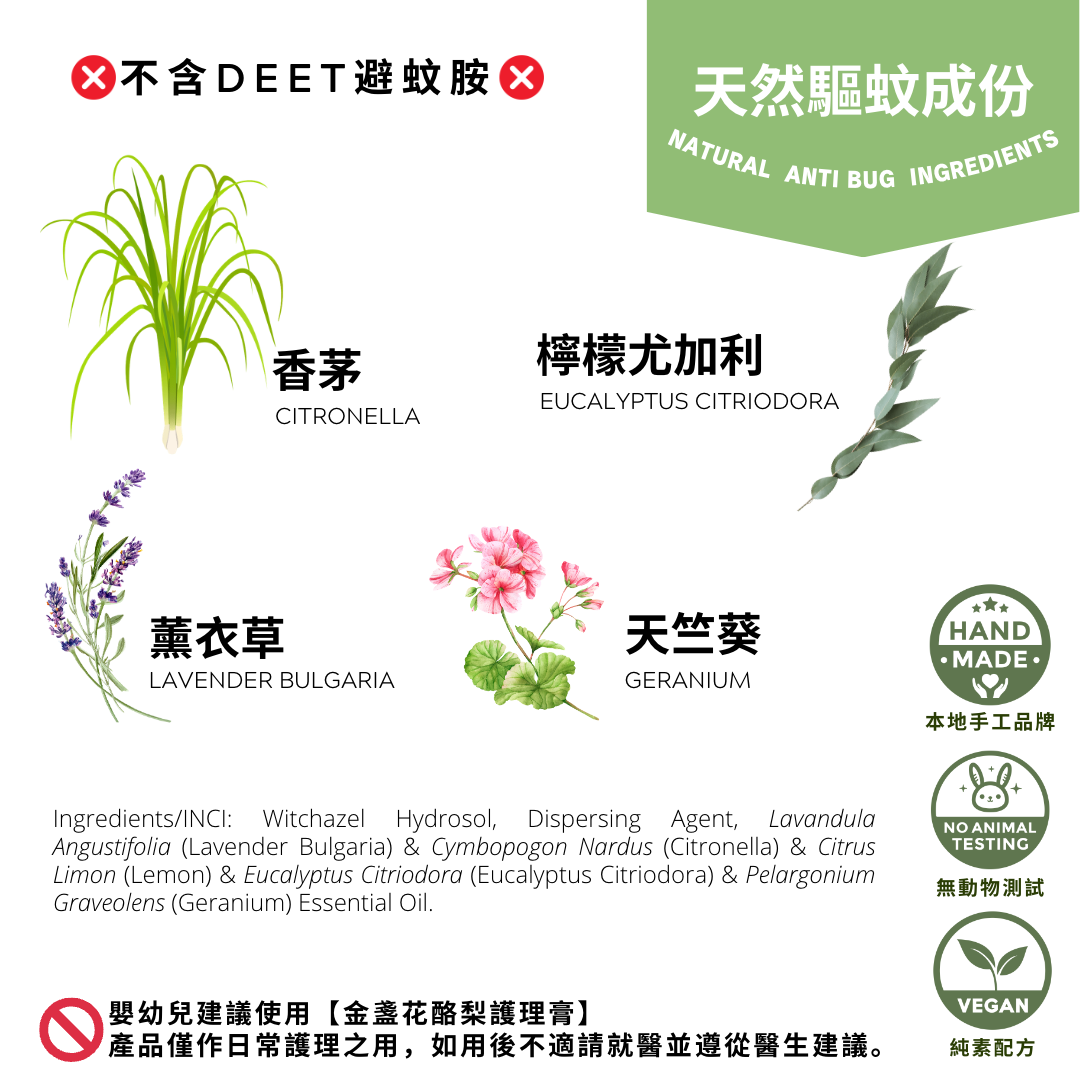 2) 以多種天然香薰油作為驅蚊主要成份,如香茅、保加利亞薰衣草、檸檬尤加利、檸檬精油等。