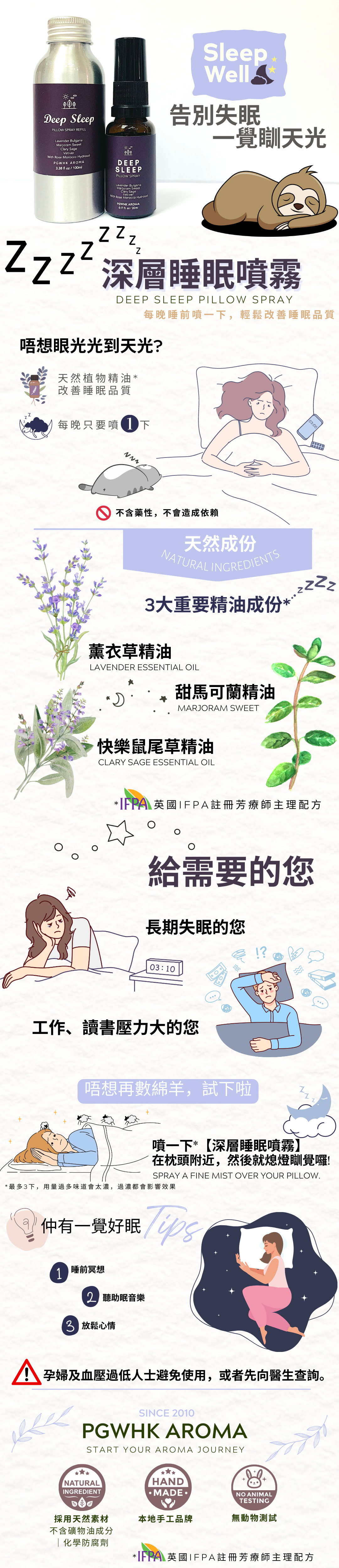 以薰衣草、甜馬可蘭、快樂鼠尾草混合精油配方調配的【深層睡眠噴霧】,助您告別失眠,輕鬆改善睡眠質素。