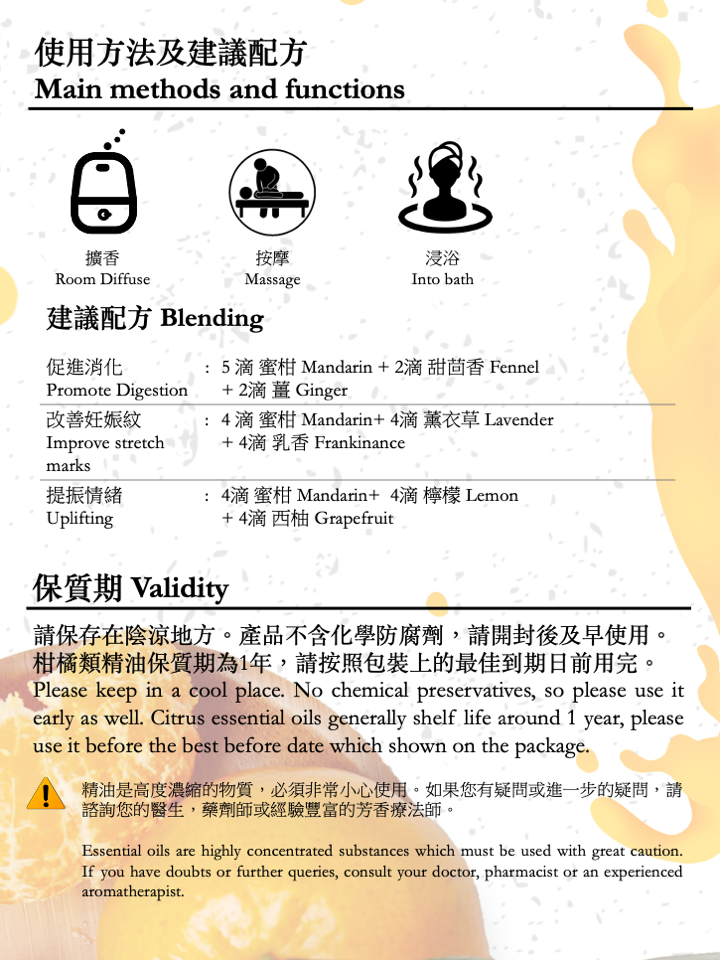 柑橘類精油保質期為1年,請按照包裝上的最佳到期日前用完。