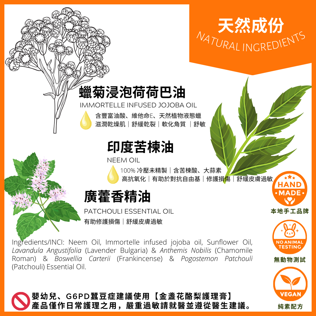成分: 苦楝油、蠟菊浸泡荷荷巴油、葵花籽油、保加利亞薰衣草+羅馬洋甘菊+乳香+廣藿香精油