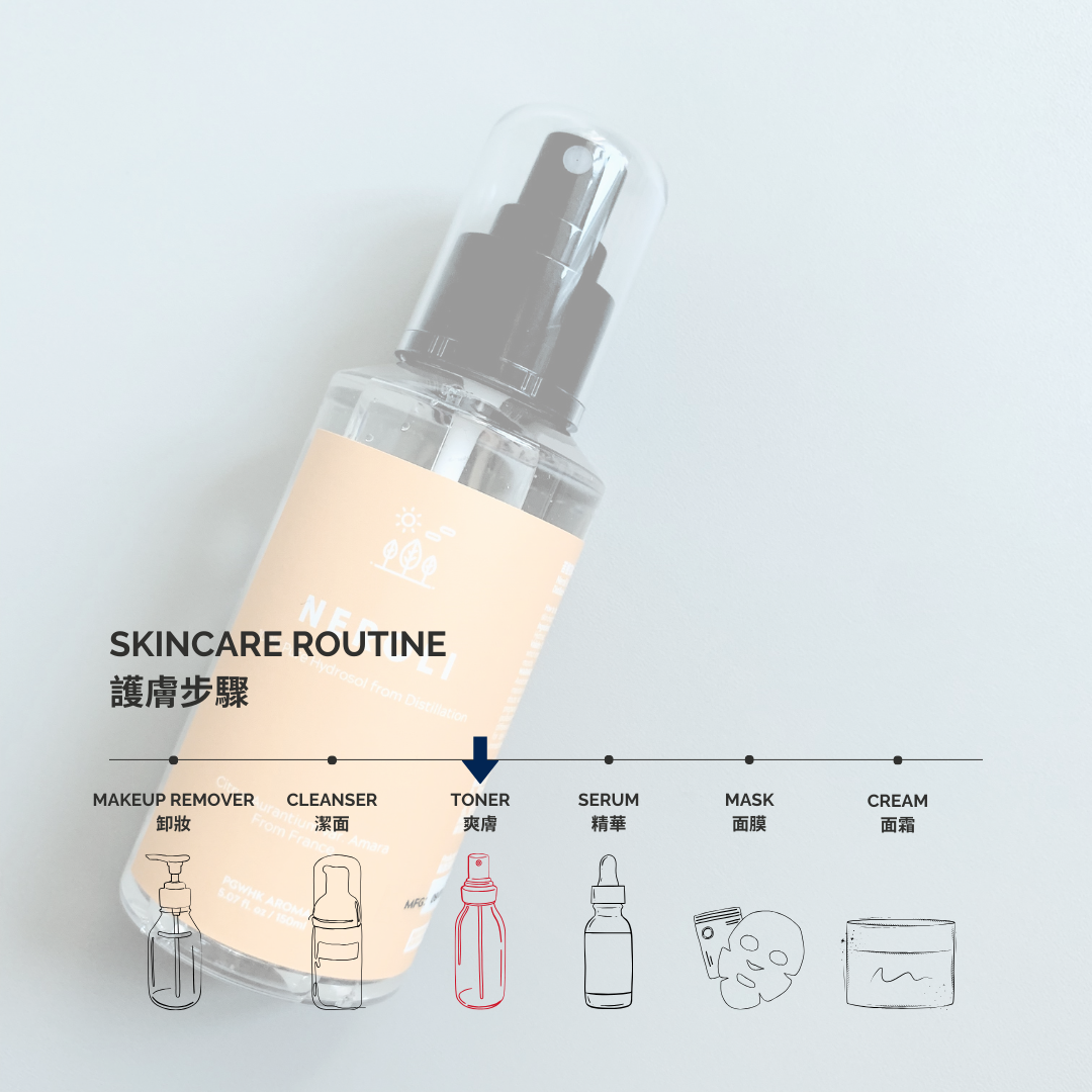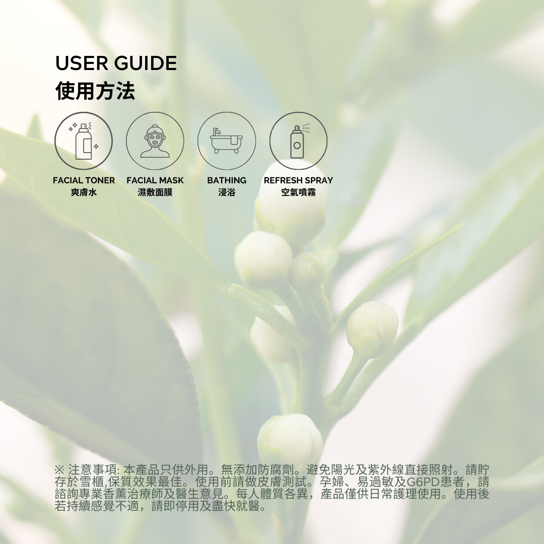 注意事項: 只供外用。無添加防腐劑。避免陽光及紫外線直接照射。請貯存於雪櫃,保質效果最佳。使用前請做皮膚測試。孕婦、易過敏及G6PD患者,請諮詢專業香薰治療師及醫生意見。每人體質各異,產品僅供日常護理使用。使用後若持續感覺不適,請即停用及盡快就醫。