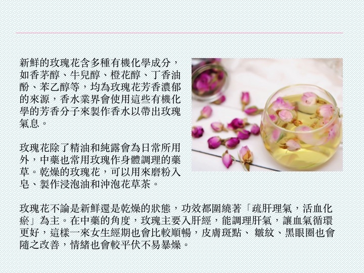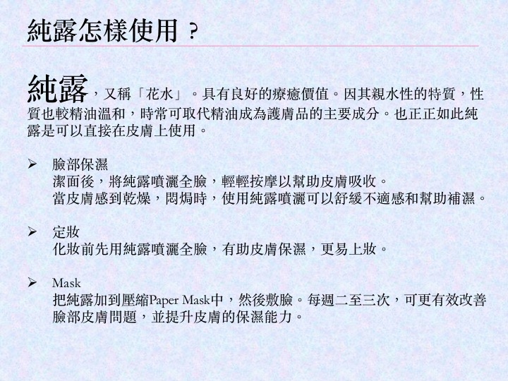優點 美白、收斂、抗老化、修復、保濕、抗敏、養膚作用,舒緩疲憊肌膚,促進新陳代謝、增進活力
