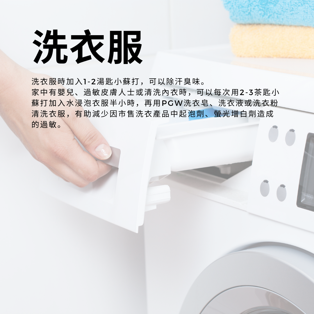 家中有嬰兒、過敏皮膚人士或清洗內衣時,可以每次用2-3茶匙小蘇打加入水浸泡衣服半小時,再用PGW洗衣皂、洗衣液或洗衣粉清洗衣服,有助減少因市售洗衣產品中起泡劑、螢光增白劑造成的過敏。