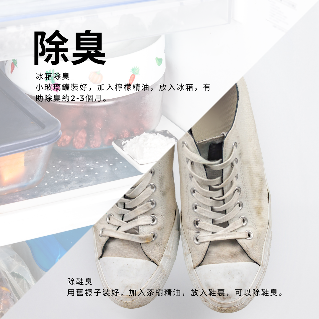 冰箱除臭: 用小玻璃罐裝好,加入檸檬精油,放入冰箱,有助除臭約2-3個月。