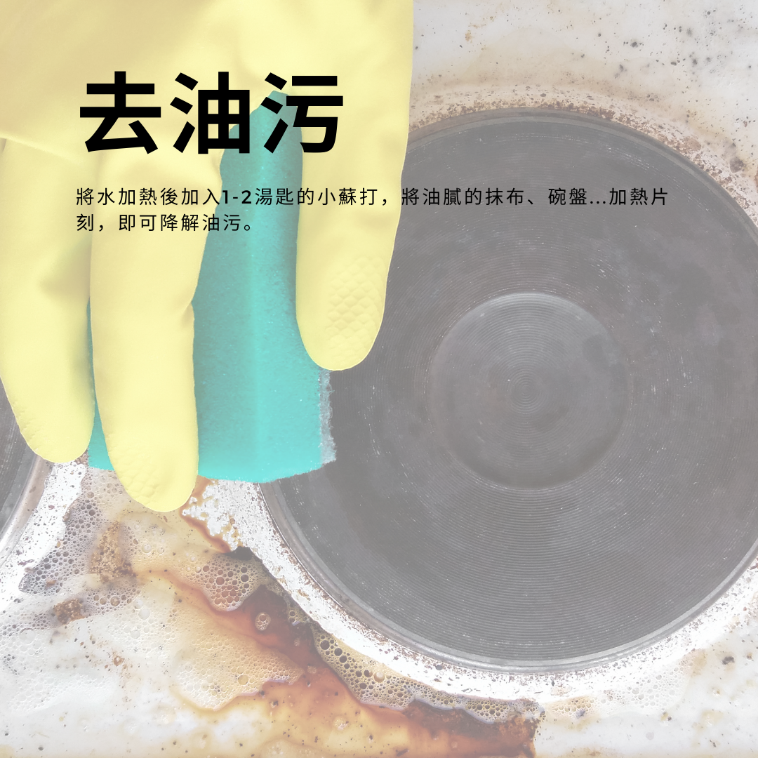 將水加熱後加入1-2湯匙的小蘇打,將油膩的抹布、碗盤...加熱煮一下,即可以降油污。